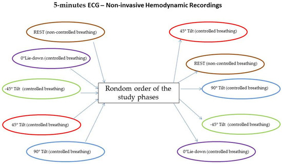 For the study purpose, only healthy volunteers were enrolled in the present analysis. All participants underwent a short-term (5 min) single-lead ECG and noninvasive hemodynamic recordings (PhysioFlow; Manatec Biomedical, Poissy, France) lying supine over the tilt-table during free breathing (rest) and during controlled breathing (15 breaths/minutes) lying with the following tilt angles: (a) lying supine at 0° (0° L-d); (b) lying down at −45° (−45° T), tilting up at 45° (45° T), and tilting up 90° (90° T). The order of the study phases was randomly chosen [10] and each one was always preceded and followed by a rest session of 5 min. Hemodynamic recordings have been double-checked by echocardiographic tests and twelve leads surface ECG. The PhysioFlow system provided a self-correction to minimize artifacts and noises.