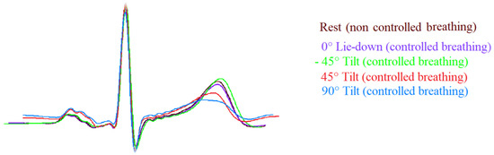 Template of ECG signals (II lead) during the different study phases. Note the T wave amplitude was flatter during passive positive standing with 45° (45° T, red) and 90° (90° T, blue) tilt table angle and it was sharper during head-down (−45° T, green) and rest (brown) in comparison to lay-down (0° L-d, purple).