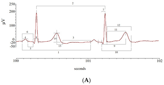 The mean and standard deviation (SD) values of the following ECG intervals and segments were calculated: R-R intervals (RR); P-P intervals (PP), from the beginning of two consecutive P waves; P wave intervals (P), from the start to the end of a single P wave; P-Q intervals (PQ), from the start of P to the Q waves; P-Q segments (PeQ), from the end of P to Q waves; Q-R intervals (QR), from Q to the peak of R waves; Q-R-S intervals (QRS), from Q to S waves; Q-T peak intervals (QTp), from Q to the peak of T waves; Q-T end (QTe), from Q to end of T waves; ST peak segments (STp), from S to the peak of T waves; ST end segments (STe), from S to the end of T waves; T peak T end intervals (Te), from peak to end of T waves; T end P interval (TeP), from the end of T to start of P waves (Figure 3).