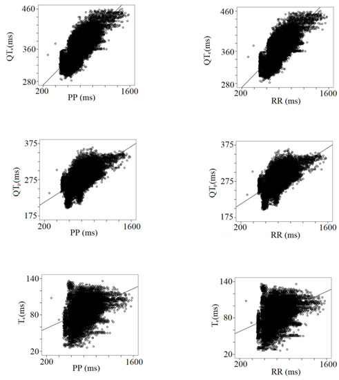 Correlation between PP or RR intervals with repolarization data, QTe (from q to the end of T wave), QTP (from q to the peak of T wave), and Te (from the peak to the end of T wave).