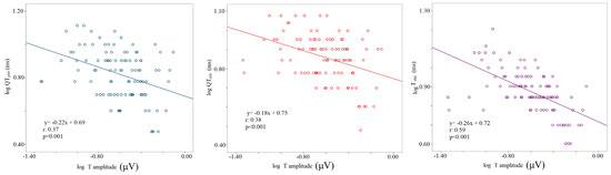 Correlation between T wave amplitude and repolarization temporal dispersion data, the logarithm of voltage (mV), the logarithm of the standard deviation of QTp (QTpSD) (left panel), QTe (QTeSD) (middle panel), and Te (from the peak to the end of T wave) (right panel).