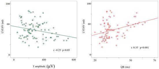 Correlation between left ventricular end-systolic volume or T wave amplitude (μV) (left panel) and QR interval (from the q to the R-wave) (ms) (right panel).