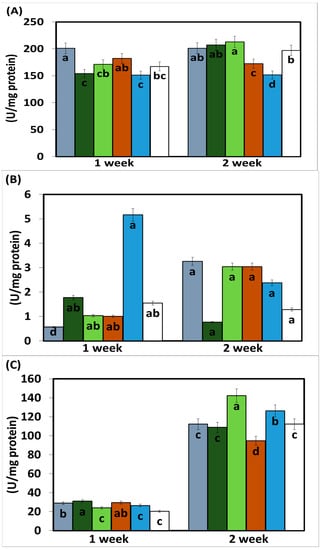 The other measured enzymatic activity was from the enzyme catalase (CAT), which showed differences between the group treated with EASSs at 12.5 ppm and without treatment (control positive) at 15 days after the treatments, as shown in Figure 4B. The group treated with EASSs at 12.5 ppm was the lowest CAT activity. At 30 days, no statistical differences were obtained between groups.