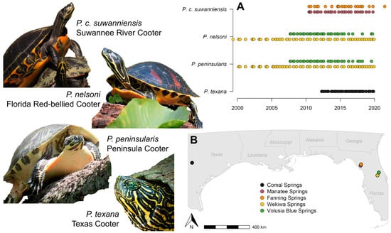- Heinrich, G.L.; Jackson, D.R.; Walsh, T.J.; Lee, D.S. Southernmost occurrence of the Suwannee Cooter, Pseudemys concinna suwanniensis (Testudines: Emydidae). J. North Am. Herpetol. 2015, 1, 53–59. [Google Scholar] [CrossRef]