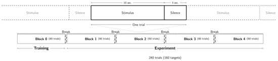 All auditory stimuli were composed of a multi-tone masker and, in two thirds of the trials, a target as depicted in Figure 1 (left). Since the acoustic parameters of the masker and the target highly influence the target detection [10,20,21,22,26,27,74,75,76], they were chosen according to a previous study [76] in order to provide a long enough delay between the beginning of the trial and the target detection, and a performance of around 70%. The target tones were presented at the same level as the individual masker tones, i.e., a target-to-masker intensity ratio of 0 dB [27].