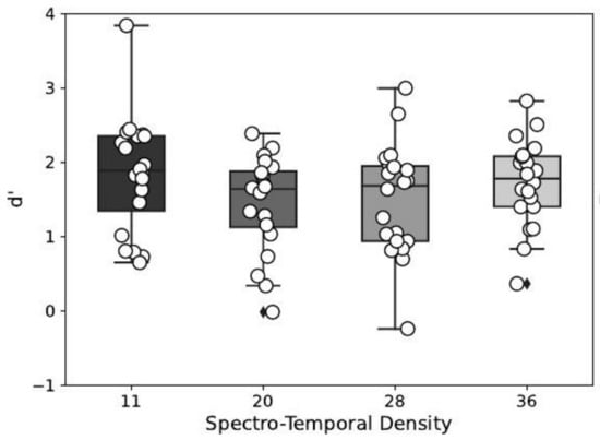 The effect of the masker’s spectro-temporal density on the detection performance index is depicted in Figure 4. This effect was statistically significant ( F ( 3 , 57 ) = 4.46 , p = 0.01 ), and post hoc tests show that the detection performance index was significantly lower for a masker density of 20 and 28, compared to a density of 11. No other significant effect was found for the other multiple comparisons (see Table 1).