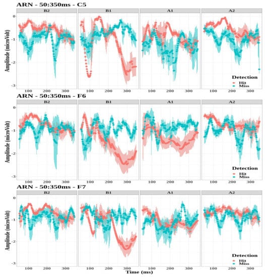 • The ARN amplitude did not differ significantly between detection conditions for the three electrodes (C5: F ( 1 , 81 ) = 0.69 , p = 0.41 ; F6: F ( 1 , 95 ) = 3.47 , p = 0.07 ; and F7: F ( 1 , 90 ) = 2.74 , p = 0.1 ).
