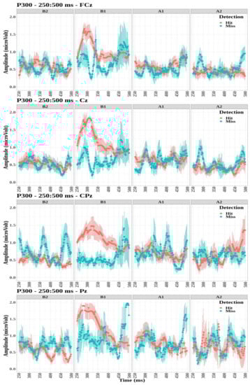 The P300 component was observed in the sagittal cluster through electrodes FCz, Cz, CPz, and Pz (Figure 6). Compared evoked waveforms (see Figure A1, Figure A2, Figure A3 and Figure A4) show that the FCz, Cz, CPz, and Pz electrodes notably displayed a P300 signature with a strong transition when the targets were detected for the first tone, B1. However, this waveform was not observed for the detected targets on the other tones. For each electrode, the effect of detection and tone factors on the peak amplitude was studied.