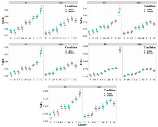• The effect of the interaction between condition and cluster was not significant (SpEn: F ( 8 , 647 ) = 0.25 , p = 0.98 ; ApEn: F ( 8 , 647 ) = 0.29 , p = 0.96 ; SaEn: F ( 8 , 647 ) = 0.29 , p = 0.96 ; PeEn: F ( 8 , 647 ) = 0.13 , p = 0.99 ; and SvEn: F ( 8 , 647 ) = 0.18 , p = 0.99 ).