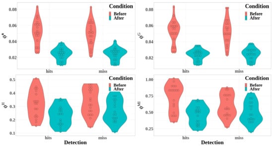 • The entropy measures were significantly higher when the target was detected (hits) than when the target was not detected (miss), except for the singular-value entropy (SpEn: F ( 1 , 647 ) = 6.64 , p = 0.01 , η 2 = 0.01 ; ApEn: F ( 1 , 647 ) = 7.94 , p = 0.005 , η 2 = 0.01 ; SaEn: F ( 1 , 647 ) = 5.54 , p = 0.019 , η 2 = 8.49 × 10 3 ; PeEn: F ( 1 , 647 ) = 91.16 , p < 0.001 , η 2 = 0.12 ; and SvEn: F ( 1 , 647 ) = 1.65 , p = 0.19 ).