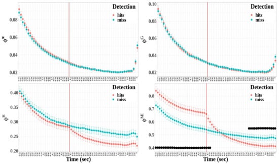 Figure 8. Mean values and standard error bars of entropy measures computed for each of the time windows from 3 to + 3 s, respectively, before and after the time reference (red line) for the fronto-central cluster. The values of the measures were estimated from 1000 point windows. The black dots show the time windows where a significant difference was found in the model between detection and non-detection.