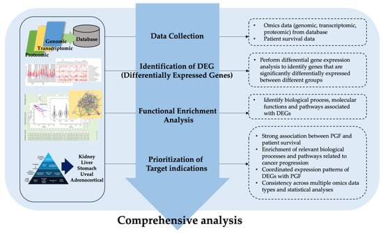 In our research, we followed a computational comprehensive analysis framework to assess the potential of a target molecule for cancer drug development (Figure 1). The analysis proceeded in a sequential manner, beginning with data collection from various sources, including publicly available gene expression datasets and patient survival data. Next, we performed an identification step to determine the differentially expressed genes (DEGs) associated with the target molecule. Subsequently, a functional enhancement analysis was conducted to evaluate the functional significance of the DEGs, employing enrichment analysis techniques such as gene ontology analysis and pathway analysis. Finally, we prioritized target-indications based on predetermined criteria, taking into consideration factors such as clinical relevance and therapeutic potential. By following this systematic order of analysis, we aimed to provide a comprehensive and objective assessment of the target molecule’s potential for cancer drug development.