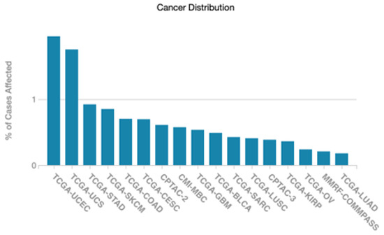 Distribution of PGF somatic mutations across the TCGA project cancer types. Abbreviations: TCGA, The Cancer Genome Atlas; UCEC, Uterine Corpus Endometrial Carcinoma; UCS, Uterine Carcinosarcoma; STAD, Stomach Adenocarcinoma; SKCM, Skin Cutaneous Melanoma; COAD, Colon adenocarcinoma; CESC, Cervical squamous cell carcinoma; CPTAC-2, Clinical Proteomic Tumor Analysis Consortium 2; CMI-MBC, Count Me In—The Metastatic Breast Cancer; GBM, Glioblastoma; BLCA, Urothelial Bladder Carcinoma; SARC, Sarcoma; LUSC, Lung Squamous Cell Carcinoma; CPTAC-3, Clinical Proteomic Tumor Analysis Consortium 2; KIRP, Kidney renal papillary cell carcinoma; OV, Ovarian Cancer; MMRF-COMMPASS, Multiple Myeloma Research Foundation The CoMMpass trial; LUAD, Lung Adenocarcinoma.