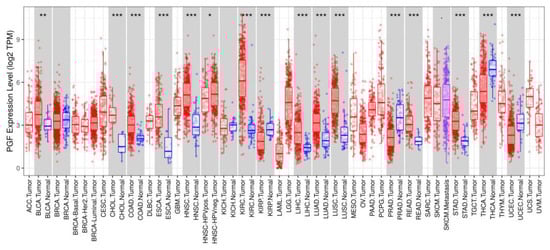 We performed survival analysis for evaluation of the prognostic effect of PGF. The GEPIA (http://gepia.cancer-pku.cn/) (accessed on 30 March 2022) provided customizable functions for RNA sequencing expression analysis according to cancer types and pathological stages, and for patient survival prognosis based on TCGA data [].