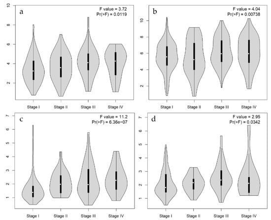 Gene expression violin plots based on patient pathological stage. In CESC (a), KIRC (b), KIPR (c), and UCEC (d), the PGF gene expression levels are associated with pathological stages.