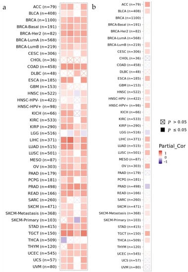 Cancer types showing a strong positive correlation between PGF and CAF expression were KIRP, LIHC, LUAD, PRAD, READ, STAD, and TGCT (Figure 5a). ACC, ESCA, HNSC_HPV-positive, LIHC, LUSC, OV, and TGCT cancer types showed strong positive correlations between PGF and MDSC expression (Figure 5b).