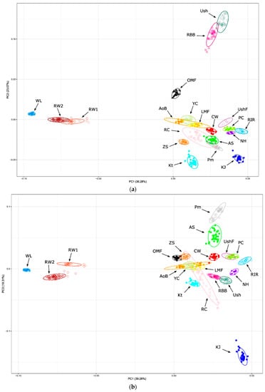 - Weir, B.S.; Cockerham, C.C. Estimating F-statistics for the analysis of population structure. Evolution 1984, 38, 1358–1370. [Google Scholar] [CrossRef]