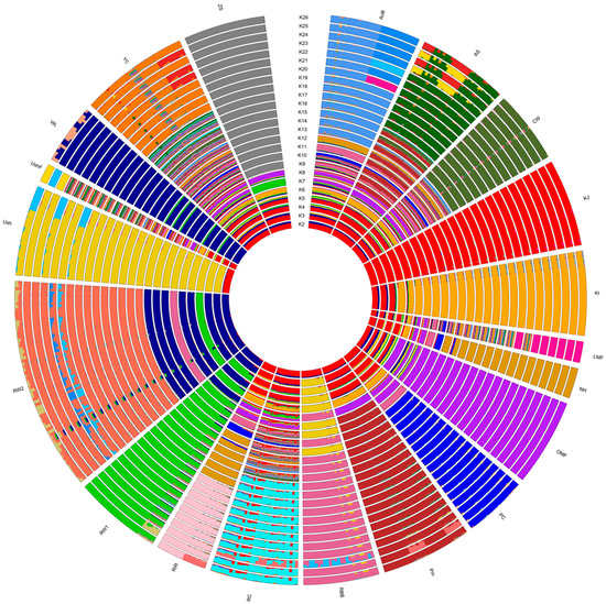 - Wu, Z.; Bosse, M.; Rochus, C.M.; Groenen, M.A.M.; Crooijmans, R.P.M.A. Genomic insight into the influence of selection, crossbreeding, and geography on population structure in poultry. Genet. Sel. Evol. 2023, 55, 5. [Google Scholar] [CrossRef]
