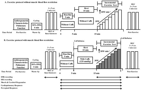 Baseline values were recorded for 5 min after stabilization of the hemodynamic parameters, while the participant was resting in a back-supporting chair, with their legs bent at the hip and knee (~90°). Thereafter, according to the experimental condition, thigh cuffs were inflated at 120 mmHg (or not) for 10 min, with the participant remaining in the same position. Next, the participant performed incremental exercise to exhaustion on an electronically braked cycle ergometer (Lode RH, Groningen, The Netherlands), either without (NC) or with (WC) muscle blood flow restriction. The initial workload was set at 30 W with increments of 30 W per min until volitional exhaustion (Figure 1). During exercise, participants were instructed to maintain pedaling rates at 80–90 rpm; verbal encouragement was provided throughout the last phases of each trial. O2max was considered the highest mean value recorded during the last 15 s of exercise, as previously suggested [38], if at least three of the following criteria were satisfied: (1) identification of a plateau in oxygen uptake (O2) or an increase smaller than 150 mL·min−1, despite the increase in power output; (2) volitional exhaustion or/and inability to maintain a pedaling rate of 50 rpm, despite strong verbal encouragement; (3) a heart rate within 10% of the age-predicted maximum; and (4) a respiratory exchange ratio ≥1.10 based on the American Heart Association and American College of Sports Medicine guidelines [39]. PPO was defined as follows: PPO = POfinal + (t/60 × 30 Watts), where POfinal is the last completed workload and t is the number of seconds for which the final uncompleted workload was retained [40].