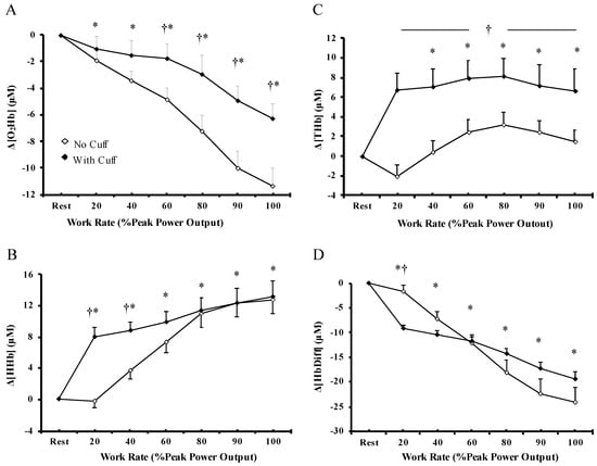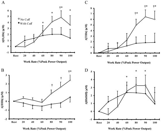 Muscle concentration changes in (A) oxyhemoglobin, (B) deoxyhemoglobin, (C) total hemoglobin, and (D) hemoglobin difference during incremental cycle ergometer test without (◊) and with (♦) muscle blood flow restriction at relative work rate. Values are means ± SEM of 13 participants. † Significant differences between no cuff and with cuff condition (p < 0.05). * Significant differences compared to rest (p < 0.01).