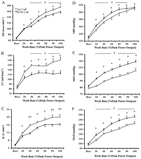 Cardiovascular response during incremental cycle ergometer test without (◊) and with (♦) muscle blood flow restriction. Heart rate (HR; (A)), stroke volume (SV; (B)), cardiac output (; (C)), systolic blood pressure (SBP; (D)), diastolic blood pressure (DBP; (E)), and mean arterial pressure (MAP; (F)). Values are means ± SEM of 13 participants. † Significant differences between no cuff and with cuff condition (p < 0.05). * Significant differences compared to rest (p < 0.01).