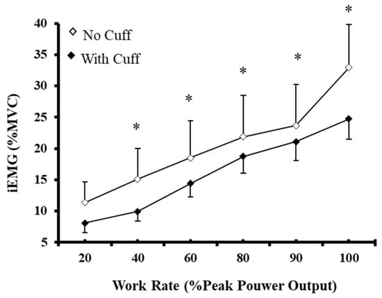 Integrated electromyography (iEMG) activity during the incremental cycle ergometer test without (◊) and with (♦) muscle blood flow restriction. Values are means ± SEM of 13 participants. * Significant differences compared to 20% PPO (p < 0.01).