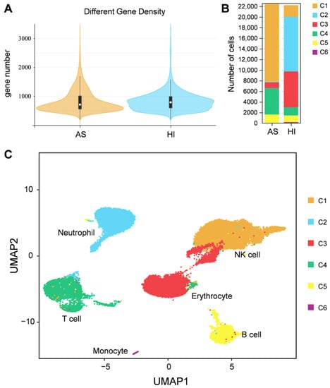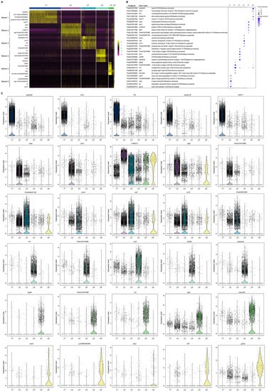 To group single cells with similar gene expression, filtration of the abnormal cells is necessary, including the removal of polycells based on the cellular rate and elimination of abnormal cells based on the gene and UMI number. DoubletFinder (v2.0.3) [43] was used to calculate the probability of GEM multicellular (proportion of artificial k-nearest neighbors), and then the multicellular rate of each sample was calculated based on the relationship between the effective cell number given by 10X official and the multicellular rate, and the multicellular filtering threshold of each sample was determined (NS: 9.55; HI: 1.79). Additionally, cells detected with less than 200 genes or more than 1600 genes and UMIs numbering more than 27,000 were excluded. After filtration, we obtained a total of 11,262 cells and a median value of 1488 UMIs and 723 genes per cell in hemocytes of the active state and a total of 11,104 cells and a median value of 2251 UMIs and 765 genes per cell in hemocytes of the hibernation period (Figure 2A and Figure S1, and Table S1). Based on the mutual nearest neighbor methodology, we first combined the active state samples and hibernation period and found there are 6 cell types in P. cantorii hemocytes (Figure 2B,C). Moreover, we found that clusters 1, 4, and 3 showed a high proportion of cells in hemocytes of the active state, while cells in clusters 2, 3, and 1 were highly expressed in the hibernation period (Figure 2B and Table S2). A total of 1701 markers were then predicted in hemocytes (Table S3). For each cluster, 433 (Cluster 1), 349 (Cluster 2), 90 (Cluster 3), 459 (Cluster 4), 280 (Cluster 5), and 120 (Cluster 6) markers were identified (Table S3). We then showed the top 5 expressed genes in each cluster of hemocytes and the heatmap results revealed that PCA-based cell separation was desirable in our analysis because a clear separation boundary for each cluster was detected (Figure 3A). Dot plots (Figure 3B) and violin plots (Figure 3C) of the normalized expression profiles of genes in each cell type were consistent with the cell classification displayed in the heatmap results (Figure 3A), suggesting that these genes from the nine cell groups were classically representative and well clustered.