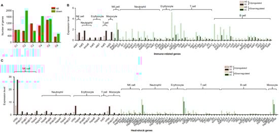 Differentially expressed genes (DEGs) in each cluster between cell clusters of P. cantorii hemocytes of active state and hibernation period. (A) Number of DEGs in each cluster. Red and green represent upregulated and downregulated genes, respectively. (B) The statistics of immune-related genes. Red and green borders represent upregulated and downregulated genes, respectively. Grey and black represent samples of active state and hibernation period, respectively. (C) The statistics of heat-shock genes. Red and green borders represent upregulated and downregulated genes, respectively. Grey and black represent samples of active state and hibernation period, respectively.