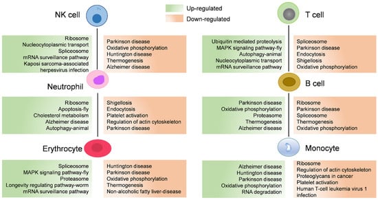 To investigate the responses to seasonal variation, we calculated the DEGs between cell populations of the hemocytes in the active state and during the hibernation period. A total of 12,546 DEGs were found with 5457 and 7089 significantly upregulated and downregulated genes, respectively (Figure 4A). Hemocytes play key roles in immunity [44]; here, we also identified immune-related genes from these DEGs and then analyzed their expression levels. Compared to hemocytes in the active state, most of these differentially expressed immune-related genes were downregulated in hemocytes during the hibernation period, except stat1, traf3, and socs6. As shown in Figure 4B, stat1 was upregulated in NK cells and erythrocytes, traf3 was upregulated in neutrophil cells, erythrocytes, T cells, and monocyte populations, and socs6 was upregulated in neutrophil populations. Moreover, we also identified 62 differentially expressed heat-shock genes (Figure 4C). Among these DEGs, several genes were upregulated including cirbp and traf3, Hsp40 family chaperone genes (DNAJ) such as dnajb1, dnajb6, dnajb14, dnajc21 and dnajc25, and HSP temperature-responsive genes (HSPs) such as hspa2, hspa4, hspa4l, hspa5, hspa8 and hspa13 (Figure 4C). Additionally, to further explore the pathways associated with DEGs, we performed a KOG function analysis of up- and downregulated DEGs. In the top 5 pathways, the upregulated genes were significantly enriched in the pathways such as “proteasome” and “nucleocytoplasmic transport” (Figure 5). Additionally, we found that several disease-associated pathways such as “endocytosis”, “platelet activation”, and “regulation of actin cytoskeleton” were abundant among downregulated DEGs (Figure 5).