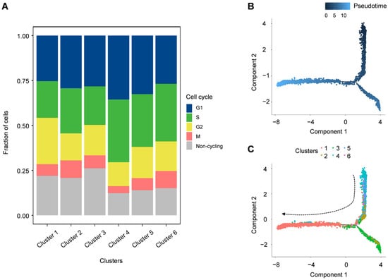 To calculate the cell cycle, the Seurat AddModuleScore function was used to score the possible cell cycle period based on the expression of characteristic cycle genes [39]. Cells with a high score of less than 0.3 were identified as noncycling cells [40]. Single-cell pseudotime trajectories were performed using Monocle 3 [41] (https://github.com/cole-trapnell-lab/monocle3, accessed on 14 February 2023). The RNA velocity analysis was performed using the package velocyto with the default parameters, and the BAM files were used as inputs. For visualization, velocity vectors were plotted as locally average vector fields on the tSNE embeddings of our high-quality cells from the previous step [42].
