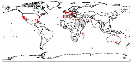 Current worldwide distribution (red dots) of the raisin moth, Cadra figulilella. Grey areas represent the distribution of the raisin moth from https://www.afromoths.net/species/show/11662 (accessed on 3 March 2023). These areas were excluded in the model fitting process due to insufficient spatial data (i.e., their precise geographic coordinates could not be determined).