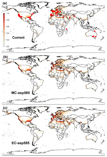 Global potential distribution of the raisin moth, Cadra figulilella, predicted by MaxEnt, where (a) denotes the potential distribution under current climate conditions, (b) denotes the potential distribution under the ssp585 scenarios by mid-century (MC, 2041–2060), (c) denotes the potential distribution under the ssp585 scenarios by end of century (EC, 2081–2100). Dark red areas denote highly suitable areas, while white areas represent unsuitable areas. Red dots denote the current worldwide distribution of the raisin moth.