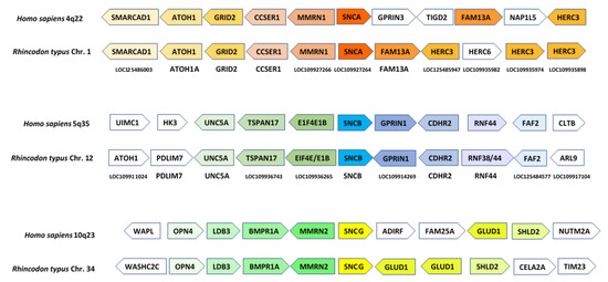 Synteny analyses comparing the regions around the three synuclein-coding genes in humans and the shark Rhincodon typus. In each region, the arrows indicate either the human genes (top line of arrows) or the most similar human genes when the R. typus genes are compared (BLASTP searches) against the complete set of human proteins (bottom line). The names of the R. typus genes are indicated below both lines of arrows. The orientations of the arrows reflect those of the genes on their respective chromosomes. Colors have been added to highlight potential orthologies.