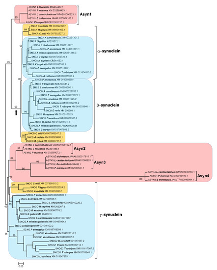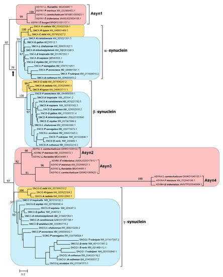 In humans, the synuclein-coding genes are located on three different chromosomes; SNCA, which encodes α-syn, is located at region 4q.22, SNCB (β-syn) at 5q.35, and SNCG (γ-syn) at 10q.23 [4,57]. Similar patterns have been observed in other species; the synuclein genes have never been found clustered together. The three genes have complex, similar exon/intron structures [2], indicating that they did not originate from retroposition events. The sequence and exon/intron structure similarities among the three SNC genes indicate that they emerged from a single ancestor gene that already had features similar to those found in the genes of current species. Because α-syn and β-syn are more similar to each other than either is to γ-syn [2], it has been proposed that the three genes originated from two conventional duplications of a single progenitor gene, the first generating an SNCG gene and an SNCA/B gene, and a second duplication, affecting the SNCA/B gene, which produced the modern SNCA and SNCB genes [7,58]. The dispersion of these three genes in vertebrates would be due to gene transpositions [7,58]. The exact timing of these putative duplications has not been established, but there is no reason to think that both occurred before the last common ancestor of all living vertebrates was born, because several studies suggested that lampreys may have only γ-syn encoding genes [7,59,60]. Therefore, the hypothesized SNCA/B progenitor could potentially still be found in particular gnathostome lineages, a fact that, if true, would strongly support the accepted model of synuclein evolution. Unfortunately, the available information about how synucleins evolved is still too fragmentary to establish whether SNCA/B genes exist or not. For example, it is not known whether α-, β- and γ-synucleins are present in all vertebrate lineages. Previous studies provided evidence for the existence of the three synucleins in several placental mammals, birds and teleostean fish species [2,3,5,7,8,61], species of two reptile genera (Anolis, Chelonia; [7]), amphibians of the Xenopus genus [5,7] and a single chondrichthyan, the Australian ghostshark, Callorhinchus milii [8,60]. However, all these studies have significant limitations. First, it is possible that additional synucleins were missing in some species due to incomplete genomic data. Some studies detected only one or two synuclein genes in certain species (see, e.g., [7]), but it is unclear whether the missing genes were truly absent or just unknown at that time. Second, the methodologies used to obtain multiple-sequence alignments and phylogenetic trees have greatly improved since those studies were published. This is critical, because suboptimal approaches can lead to artifactual tree topologies, given that synucleins are small proteins, i.e., the amount of useful information provided by their sequences is limited. Also, the C-terminal end of synucleins evolves rapidly, making it challenging to obtain reliable alignments for that region. It is also important to note that only two of the published studies [7,61] provided information on the statistical support for the tree topologies, which is essential for determining the accuracy of the proposed orthologies. Lastly, none of these studies incorporated together sequences from all the main vertebrate taxa. These methodological issues mean that, while there is no doubt that the currently accepted orthologies are correct for closely related species, they may be erroneous for distant relatives.