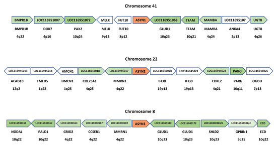 We may now explore the origin of the other two ASYN genes, which appear in the trees as close relatives to the γ-syn gene ASYN3 (Figure 4 and Figure 5). For ASYN4, which is by far the most divergent, the lack of genomic data precludes further investigating its origin. However, ASYN2 is located on Petromyzon chromosome 22, for which data are available that allow the same comparisons with human chromosomes already performed for chromosomes 8 and 41. These comparisons are also summarized in Table 2. It turns out that most genes in that chromosome have the highest similarity (“top” column) to genes