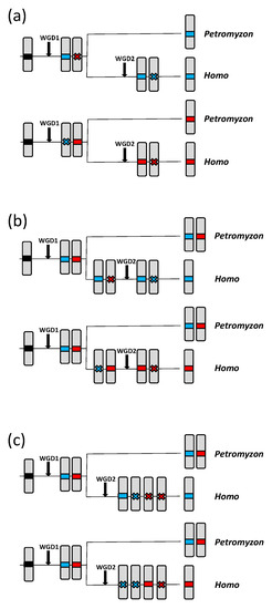 The “solo” column in Table 2 is particularly significant. While the “top” and “total” results indicate general trends regarding the similarities among the human and lamprey genes, the “solo” column accounts for gene losses, which are rare, unique events. There are several scenarios in which genes detected in a specific Petromyzon chromosome may be found isolated, without any duplicates, in humans (Figure 7; see next page). Alternatives (a) and (b) in Figure 7 involve two independent gene losses, while three losses are required in Figure 7c. It is noteworthy that, for a given Petromyzon gene, the probability of the single similar gene found in humans being either an ortholog or a paralog is the same for alternatives (b) or (c). On the contrary, for alternative (a), in which the loss occurs after WGD1 in the ancestor of all vertebrates, the gene found in humans must necessarily be an ortholog of the lamprey gene. This asymmetry is very significant in our context, because it indicates a systematic bias towards “solo” genes being true orthologs, which can therefore be used as markers to establish precise correspondences between lamprey and human chromosomes. Therefore, finding a significant deviation in the frequencies of “solo” genes from what is expected by chance (as demonstrated earlier) provides strong evidence that Petromyzon chromosome 8 corresponds to the regions now located on human chromosomes 2, 8 and 10, and Petromyzon chromosome 41 corresponding to regions of human chromosomes 4 and 5. An examination of Supplementary File S4 allows establishing in more detail the exact relationships between the Petromyzon and human chromosomes. The similarities with the lamprey genes are largely restricted to human genes located on regions 2p11-13, 4q13-25, 5q31-35, 8p11-22 and 10q11-26. This indicates that the CLGQ/Pvc8-derived genes that after WGD1 became located on chromosomes 8 and 41 of Petromyzon are now found in humans throughout the large arms of chromosomes 4 and 10, as well as in relatively small regions of the large arm of chromosome 5 and the short arms of chromosome 2 and 8.