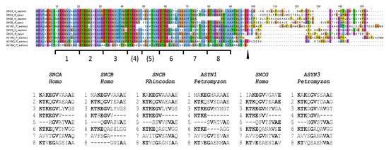 Characterizing highly divergent SNC genes provides intriguing new insights into the changes that synuclein proteins can undergo. The N-terminal repeat regions of the osteichthyan proteins analyzed prior to this study were quite homogeneous (see, e.g., [1,2,3,6,25,27]). However, when examining both chondrichthyan and agnathan proteins, a much greater diversity is observed (Figure 8; Supplementary File S6). The first interesting feature is the variability in the center of that region. In both the shark SNCB- and lamprey ASYN1-derived proteins, some amino acids are missing (Figure 8). Also, at least five independently generated small deletions can be found in that region in the 26 osteichthyan α-syn and β-syn proteins analyzed (Supplementary File S6). Given that this region is much more variable in length than previously assumed, it is reasonable to postulate that it initially consisted of typical 11-amino-acid-long repeats but is highly prone to suffer partial deletions. This may be due to the fact that it is precisely in this region (specifically, amino acids corresponding to repeat 4 in Figure 8), where the helical structure of the N-terminus of synucleins breaks under some physiological conditions, generating two small α-helices instead of a single, continuous one [14,15]. If this hypothesis is true, it would mean that the N-terminal region of synucleins originally did not have seven repeats, as generally assumed, but eight (as shown in Figure 8, bottom). The current pattern would have evolved in two steps: (1) a seven-amino-acid-long deletion, eliminating part of repeats 4 and 5, which happened before WGD1 (and it is thus found in all synucleins); and (2) additional deletions leading to a further shortening of these repeats in many lineages. Notably, in multiple cases (ASYN1 in lampreys, SNCA in Polypterus, Takifugu and Acipenser; SNCB in Takifugu and Danio), these recent deletions span four amino acids, leading to proteins that have lost exactly 11 amino acids, i.e., a complete repeat (see Petromyzon ASYN1 in Figure 8; the rest in Supplementary File S6).