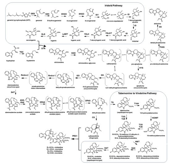 The genes that link strictosidine aglycone to the formation of iboga MIA, catharanthine, and the aspidosperma MIA tabersonine, including geissoschizine synthase (GS), geissoschizine oxidase (GO), O-acetylstemmadenine oxidase (ASO), precondylocarpine acetate synthase (PAS), and dihydroprecondylocarpine synthase (DPAS), have been identified. They set a foundation on which to develop an understanding the branching points to produce vinblastine in C. roseus [13,14,15,31]. The anticancer drug vinblastine is the dimerization product of two MIAs, catharanthine and vindoline, catalyzed by a peroxidase [33]. While catharanthine is generated through nine enzymatic steps from strictosidine, vindoline is derived from tabersonine via seven steps, which have been fully elucidated [12,34,35,36,37,38] (Figure 1). The functional characterization of those key reactions to the formation of MIAs permits further development in terms of engineering the entire MIA pathways in heterologous systems for enhanced biotechnological applications.