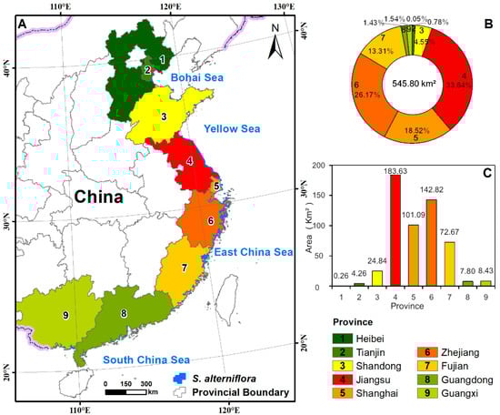 Figure 1. Spartina alterniflora spatial distribution in coastal wetlands of China, (A) Spatial distribution, (B) areal proportion, and (C) total area. Adopted by [14].