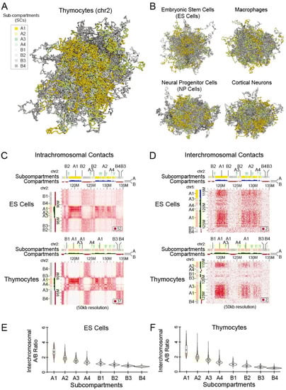 Identification of Hi-C Subcompartments. Three-dimensional plots showing chromatin interactions of the whole chromosome 2 in CD69−CD4+CD8+ thymocytes (A), as well as other four cell types containing embryonic stem (ES) cells, macrophages, neural progenitor (NP) cells, and cortical neuron (B). Eight subcompartment types (A1, A2, A3, A4, B1, B2, B3 and B4) were indicated in different colors. Heatmaps showing intrachromosomal (C) and interchromosomal (D) chromatin contacts in embryonic stem cells (upper panel) and thymocytes (lower panel), respectively. Violin plots show the interchromosomal A/B ratio for eight subcompartments in ES cells (E) or thymocytes (F).