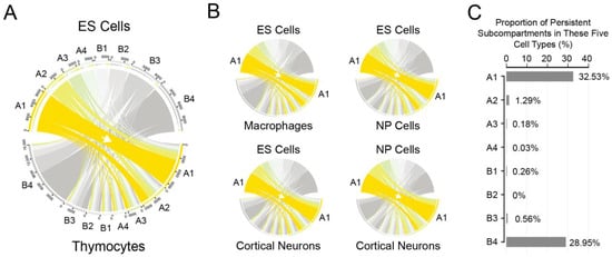 Our analysis uncovered interesting observations regarding the variability of subcompartments during transitions. We noted that subcompartments A2-B3 were more variable than subcompartments A1 and B4 in these transitions. We proceeded to calculate the proportion of subcompartment relocations derived from ES cells and showed that 32.53% of the subcompartments A1 and 28.95% of the subcompartments B4 remained in all five different cell types. By contrast, less than 1.3% of subcompartments for the other six subcompartment types (A2-B3) exhibited consistency across the five cell types (Figure 2C). We observed similar repositioning proportions in the other four cell types (Figure S2).