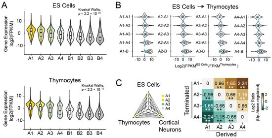 The relationship between gene expression levels and subcompartment positioning. (A) Violin plots showing the gene expression levels of total genes in eight different subcompartment types in embryonic stem cells (upper) or thymocytes (lower). FPKM, fragment per kilo-base exon per million mapped reads. (B) Relations between changes in gene expression and subcompartment switching from embryonic stem cells to thymocytes for total genes. (C) The diagram on the left panel shows subcompartment repositioning between cell types. Four types of subcompartments in ES cells, thymocytes, and cortical neurons, indicated by the colored points on each axis, were linked by black lines. Possibility of changes in gene expression (log 2 transformed) in response to subcompartment relocations in three distinct cell types. The horizontal axis shows derived subcompartments, and the vertical axis indicates the terminated subcompartments. * p < 0.05, ** p < 0.01 (Fisher’s Exact Test).