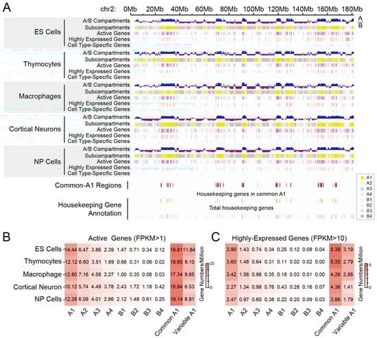 Gene density in different subcompartment types. (A) Chromatin compartment annotations of the whole chromosome 2, including A/B compartments and subcompartments. Transcription start sites of active genes (FPKM > 1, purple), highly expressed genes (FPKM > 10, red), cell type-specific genes (cyan), housekeeping genes in common-A1 regions (green), and total housekeeping genes (gray) were highlighted. Gene numbers per million of active genes (B) or highly expressed genes (C) in each subcompartment type across diverse cell types. Common A1 is consistently identified as subcompartments A1 in all five cell types. Variable A1, subcompartments A1 but apart from common A1.