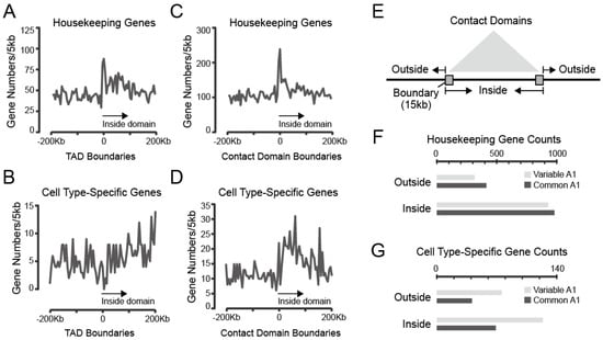 Previous studies have shown that housekeeping genes, rather than cell type-specific genes (also called tissue-specific genes), are frequently located at TADs boundaries. We confirmed the results in mouse thymocytes (Figure 6A,B) and then investigated the distribution of the two classes of genes around the boundaries of contact domains, which are defined based on high-resolution Hi-C data and present more precise local interactions. Similar to TADs boundaries, contact domain boundaries were also enriched in housekeeping genes. Notably, the normalized gene counts inside contact domains were higher than nearby outside domain regions (Figure 6C,D). Furthermore, we performed an analysis of gene distribution in common A1 and variable A1. We found a higher presence of both housekeeping and cell type-specific genes within domains. However, it is notable that, in contrast to housekeeping genes, cell type-specific genes were more frequently located in variable A1 rather than common A1 (Figure 6E–G).