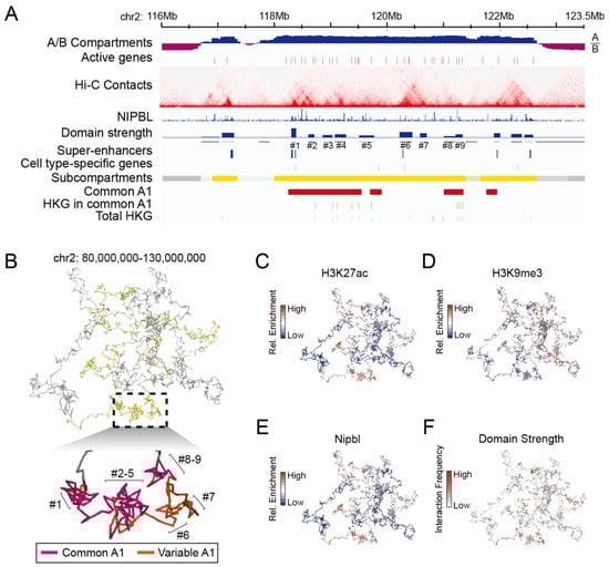 We then performed a 3D simulation to analyze the relationship between gene subcompartment positioning and their domain strength and found that strongly looped domains were indeed associated with subcompartments A1, highlighted by golden yellow (Figure 7B). As shown in the zoomed region, nine strongly looped domains containing seven in common A1 and two in variable A1, indicated in Figure 7A, were organized into a domain cluster in the 3D space (Figure 7B). Our analysis showed that subcompartment A1 regions, which were characterized by more strongly looped domains, exhibited higher levels of H3K27ac and Nipbl signals, but not heterochromatin-related H3K9me3 mark (Figure 7C–F).