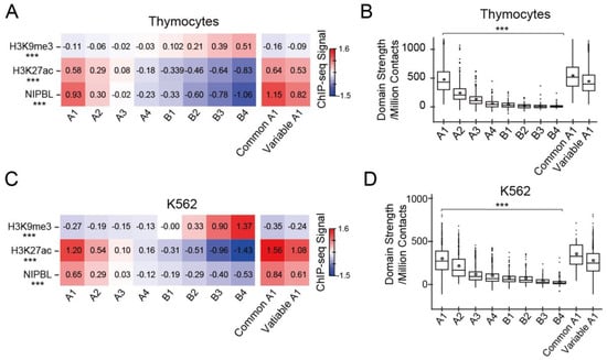 Contact domain strength in different subcompartment types in both mouse and human cells. Enrichment analysis of histone modification H3K9me3 and H3K27ac, as well as Nipbl signals in each subcompartment type across the genome in thymocytes (A) and human K562 cells (C). Contact domain strength in eight subcompartments, as well as in common and variable-A1 regions in thymocytes (B) and human K562 cells (D). The outliers were indicated by filled dots, and means denoted by open circles on the boxplot. *** p < 10−16 (Kruskal-Wallis Test).