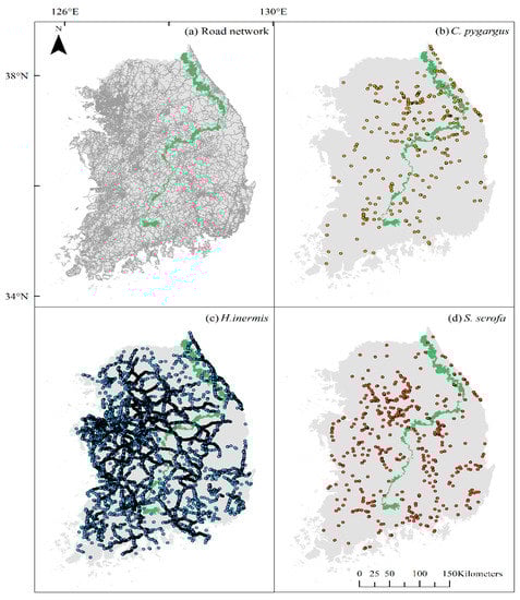 The Republic of Korea mainland with the road networks of all seven types. (a) The Baekdu-daegan mountain chain, which is a series of high mountains, is shown in green. Clusters of roads in gray are major cities. The UVC locations of Capreolus pygargus (b), Hydropotes inermis (c), and Sus scrofa (d) between 2019 and 2021 are shown using dots on the country map. The maps were generated using ArcGIS Desktop 10.8.1.