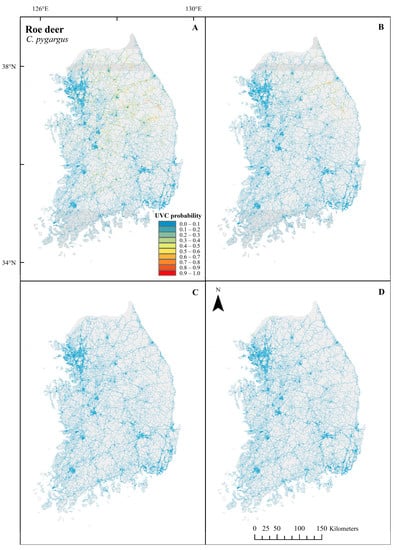 Season-based UVC probability predictions of C. pygargus in spring (A), summer (B), fall (C) and winter (D) along roads using UVC data between 2019 and 2021 in the Republic of Korea. Red and blue colors indicate a high and a low probability of UVC, respectively. The maps were generated using ArcGIS Desktop 10.8.1.