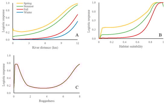 Response curves of river distance (A), habitat suitability (B) and ruggedness (C) in each season for C. pygargus using UVC data between 2019 and 2021 in the Republic of Korea. Each response curve of predicted probability is independent of other variables in the models.
