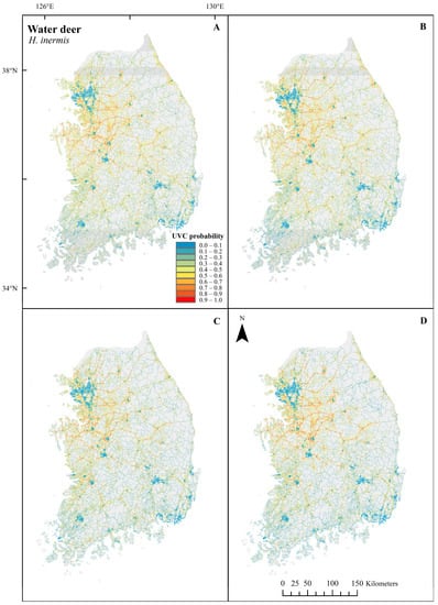 Season-based UVC probability predictions of H. inermis in spring (A), summer (B), fall (C) and winter (D) along roads using UVC data between 2019 and 2021 in the Republic of Korea. Red and blue colors indicate a high and a low probability of UVC, respectively. The maps were generated using ArcGIS Desktop 10.8.1.